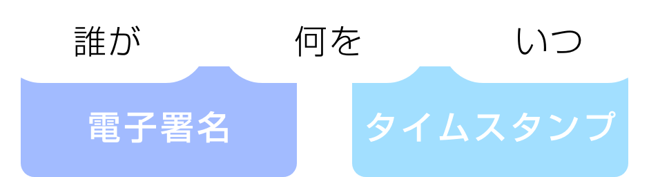 電子署名は電子文書について、「誰が」「何を」作成したかを証明し、 タイムスタンプは、電子文書の「いつ」「何を」を証明できる技術です。